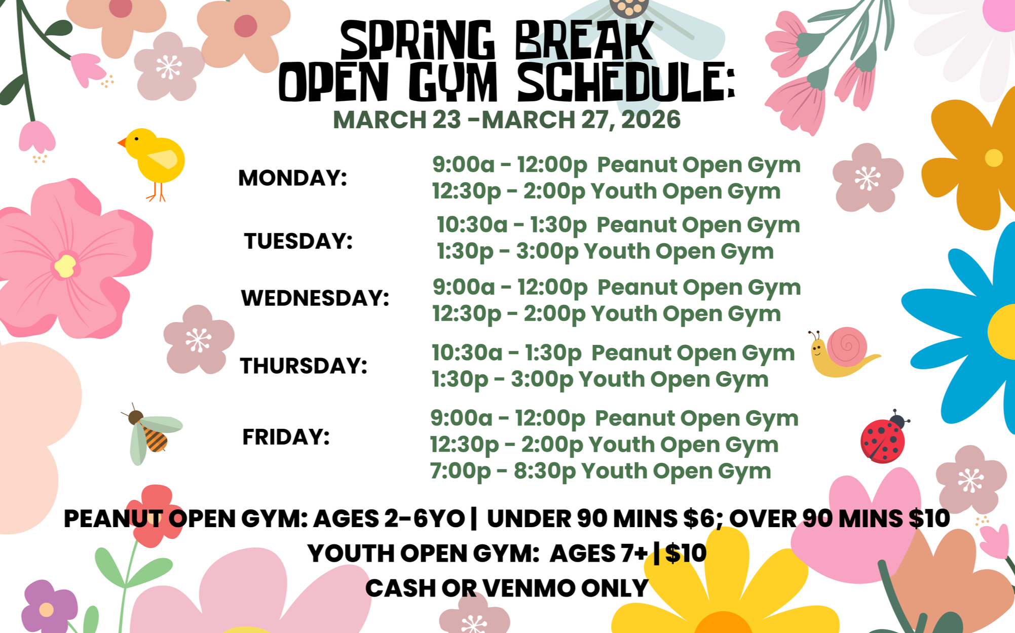 Enjoy 90 minutes of fun with your friends in our gymnastics gym! Bounce off the trampolines, swing from our ropes, or just have fun jumping into the foam pit! Parents don’t need to stay, but a waiver needs to be signed at drop off.